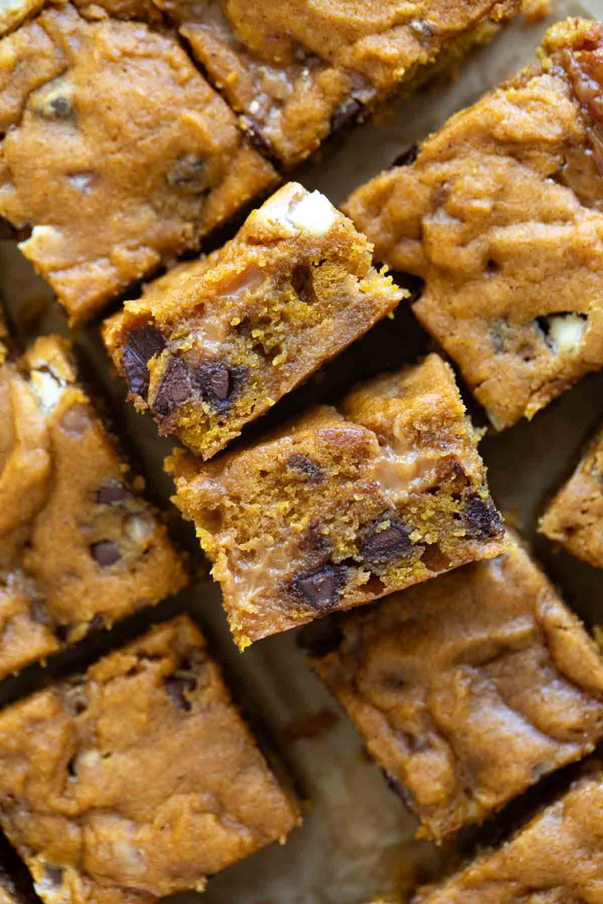 These Loaded Caramel Pumpkin Blondies are rich, chewy, and bursting with warm fall flavor. Sweet caramel, pumpkin, and two kinds of chocolate blend together for the ultimate autumn dessert. This easy recipe comes together in one bowl, and each bite tastes like pumpkin pie meets a soft, buttery blondie bar.