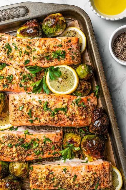 An easy, healthy dinner that comes together on one pan. Juicy salmon fillets are roasted alongside garlicky Brussels sprouts for a perfectly balanced meal that’s full of flavor and ready in just 35 minutes.