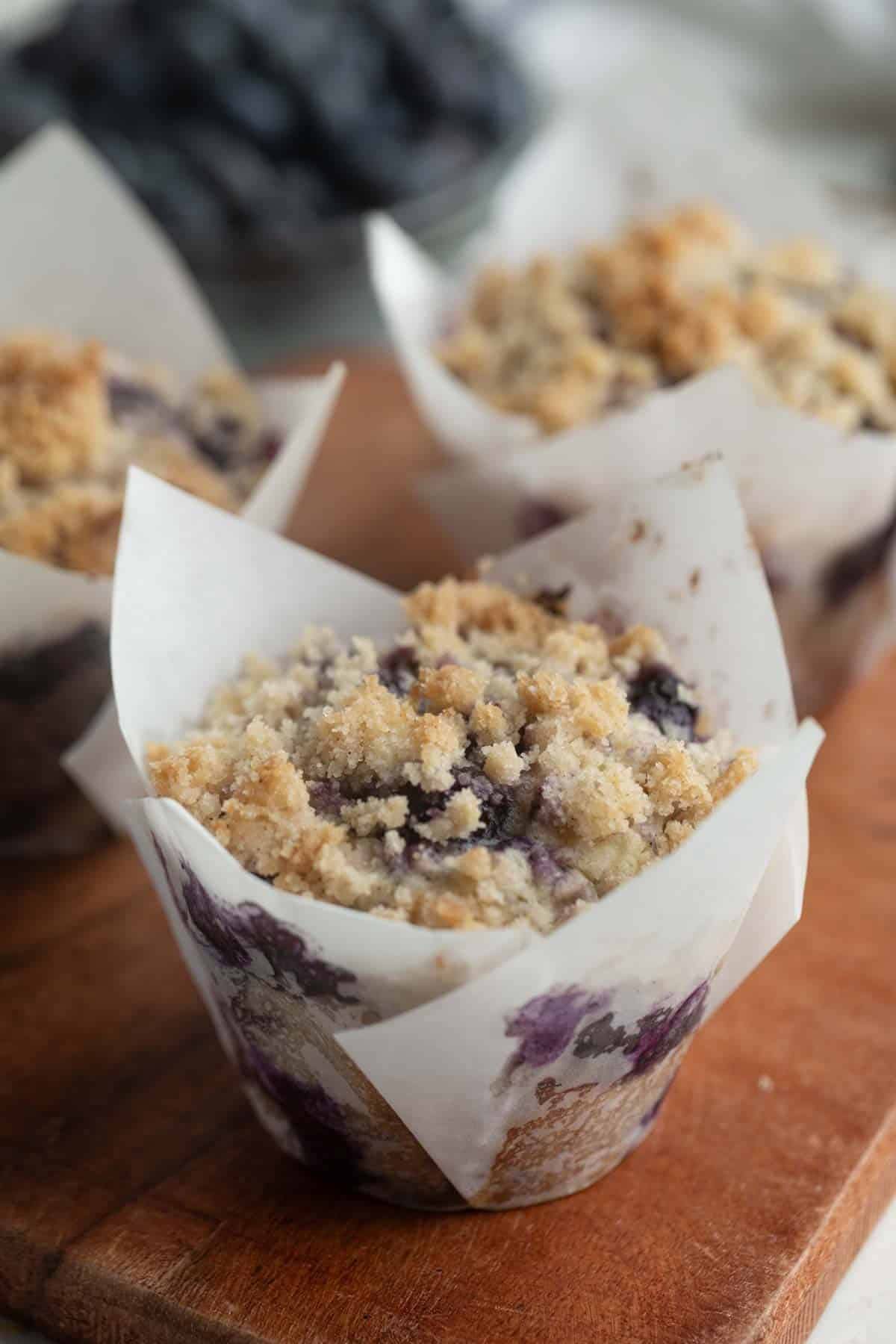 Sprinkle each muffin with a few of the remaining blueberries, then top generously with the crumb mixture.