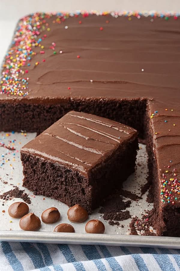 This chocolate sheet cake pairs wonderfully with a scoop of vanilla ice cream or a drizzle of chocolate sauce. It’s also a great make-ahead dessert for birthdays, holidays, and potlucks — moist, flavorful, and always a crowd favorite.