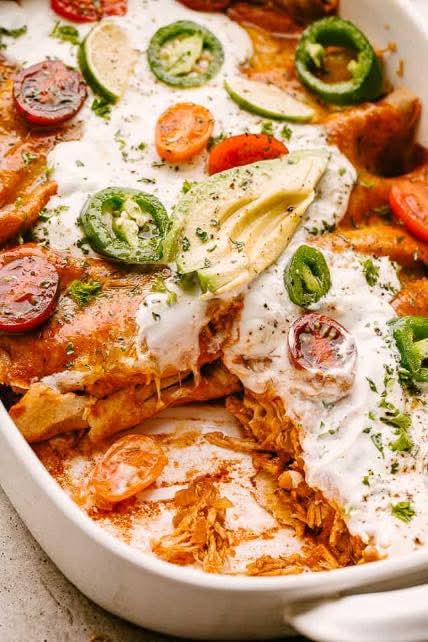 Pour in ½ cup of enchilada sauce and stir to coat the chicken. Cook for an additional 3–4 minutes, allowing the flavors to meld together. Remove from heat. - Prepare the Baking Dish