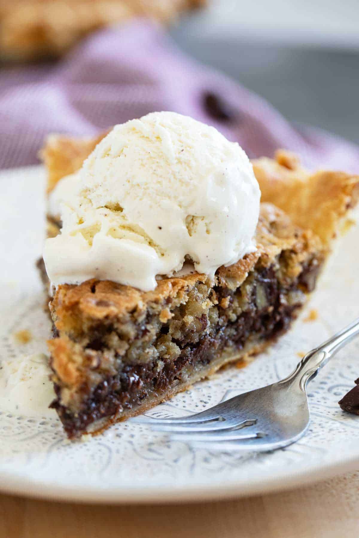 This Chocolate Chip Cookie Pie is a great make-ahead option. Bake it a day in advance, and reheat individual slices in the microwave for 15–20 seconds before serving. You can also freeze a fully baked and cooled pie for up to 2 months; just wrap tightly and thaw overnight in the refrigerator before warming through.