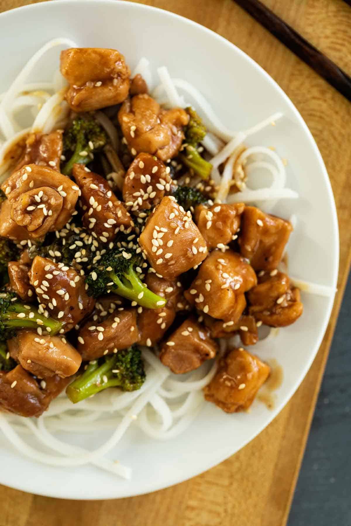Spoon the sesame chicken and broccoli over warm rice or rice noodles. Sprinkle with additional sesame seeds for a finishing touch.