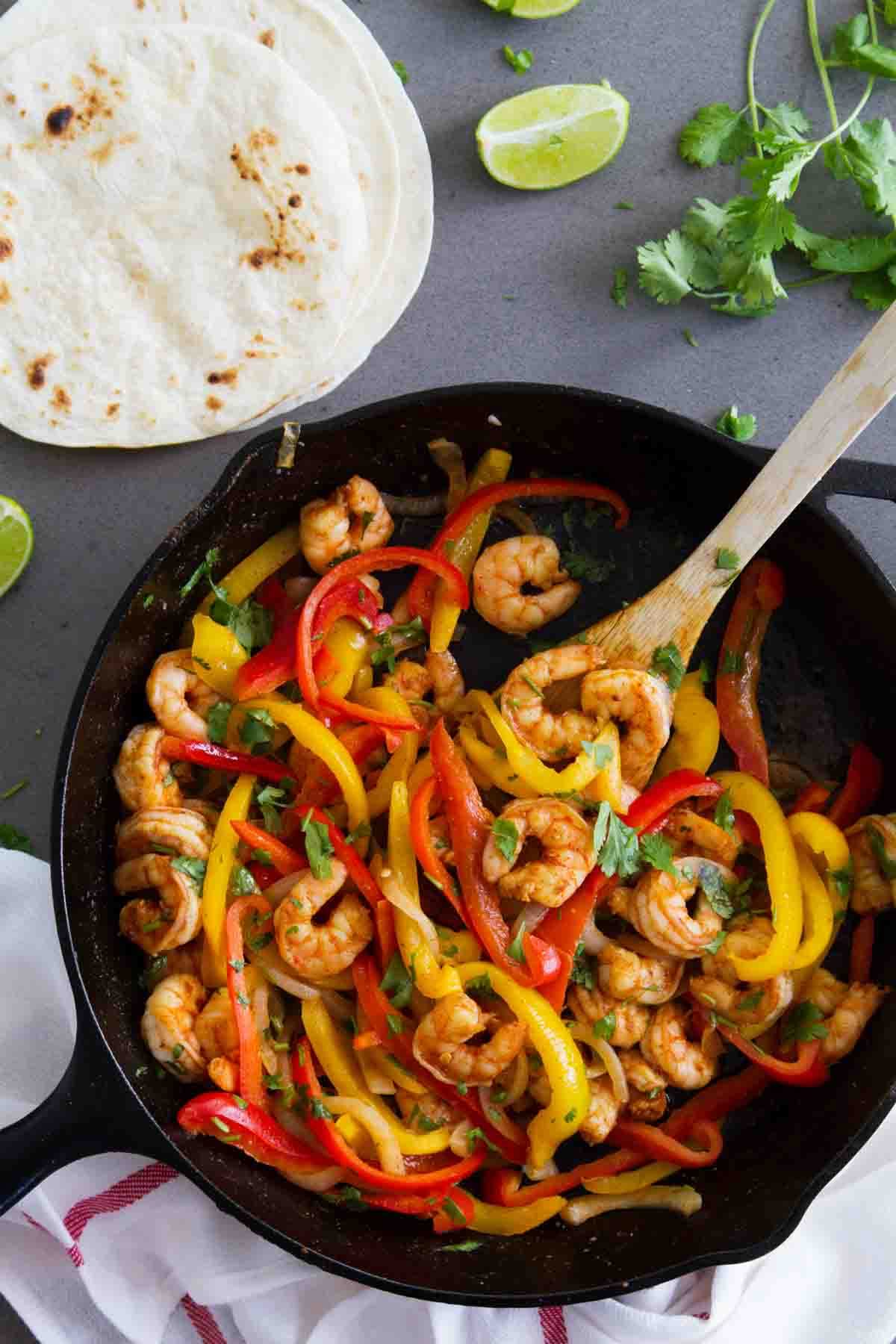 Serve the shrimp and vegetables hot with flour tortillas and your favorite toppings. The filling can also be enjoyed on its own for a lighter meal.
