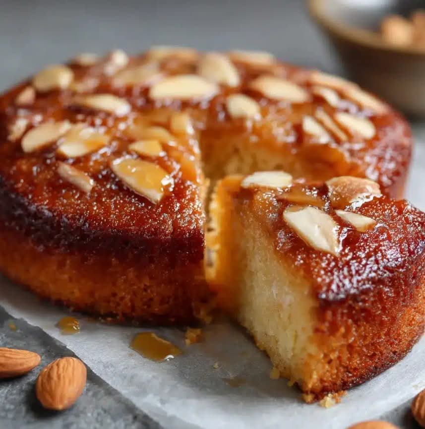 Grease and line a round or square baking pan with parchment paper. Pour the batter into the pan and smooth the surface with a spatula. Sprinkle the almond flakes evenly on top.Bake in a preheated oven at 180°C (350°F) for 50 to 55 minutes, or until a skewer inserted into the center comes out clean.