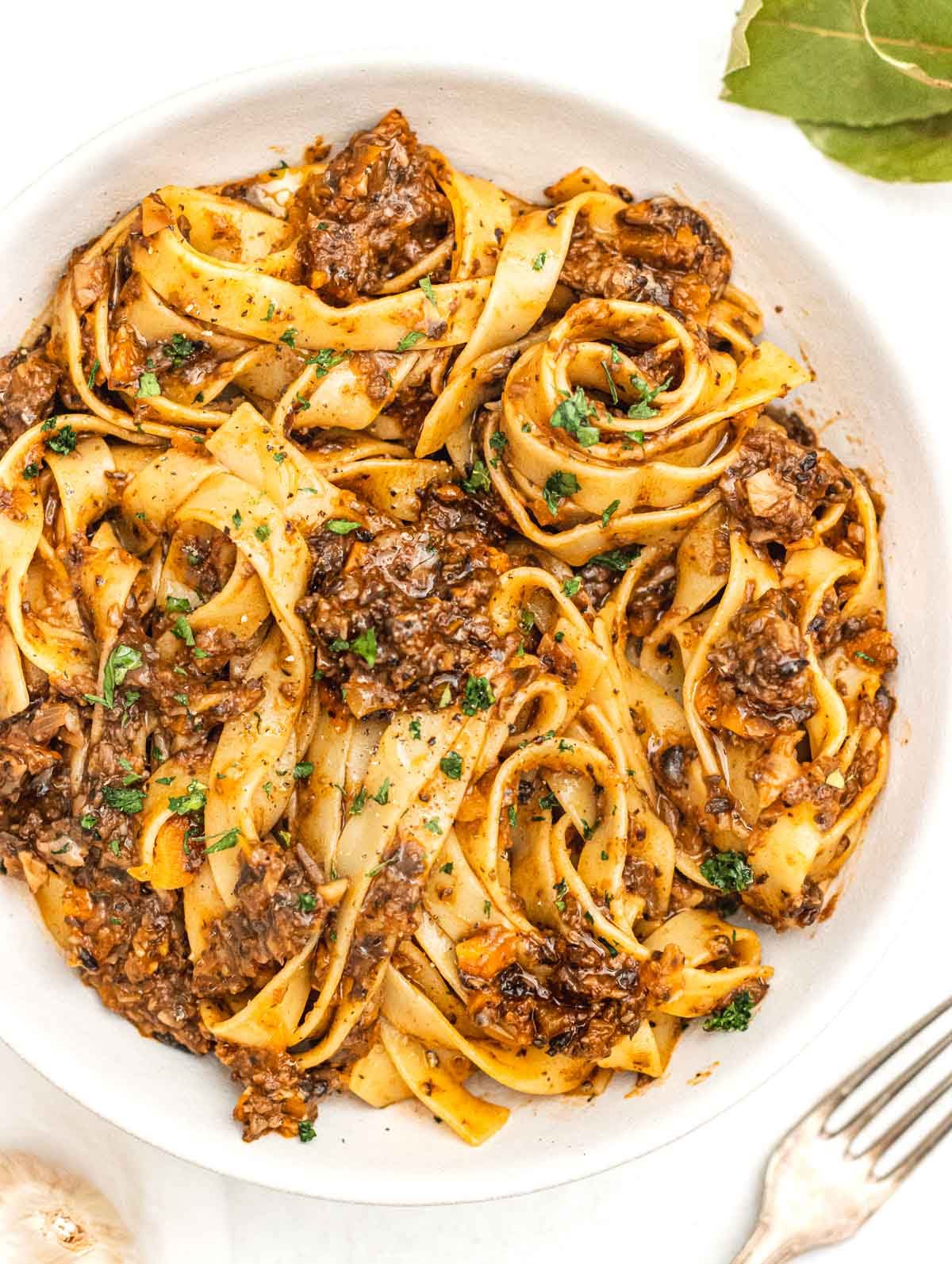 Finely chopped mushrooms create a sauce with a “meaty” consistency, while classic soffritto vegetables—onion, carrot, and celery—form a flavorful foundation. Olive oil, garlic, herbs, and tomato paste bring depth and warmth, making this pasta perfect for both busy weeknights and relaxed family dinners.