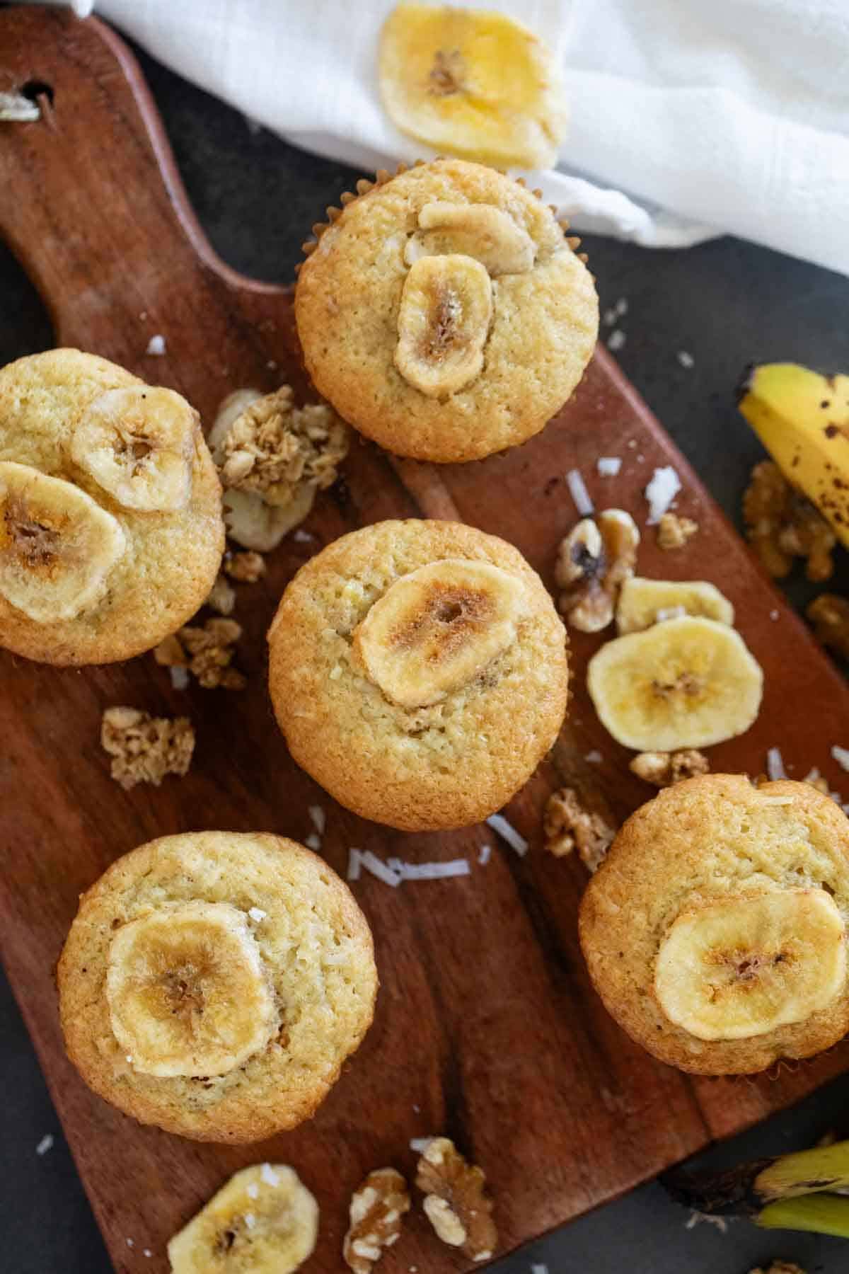 - Divide the batter evenly among the muffin cups, filling each about three-quarters full. If using banana chips, place one or two on top of each muffin.