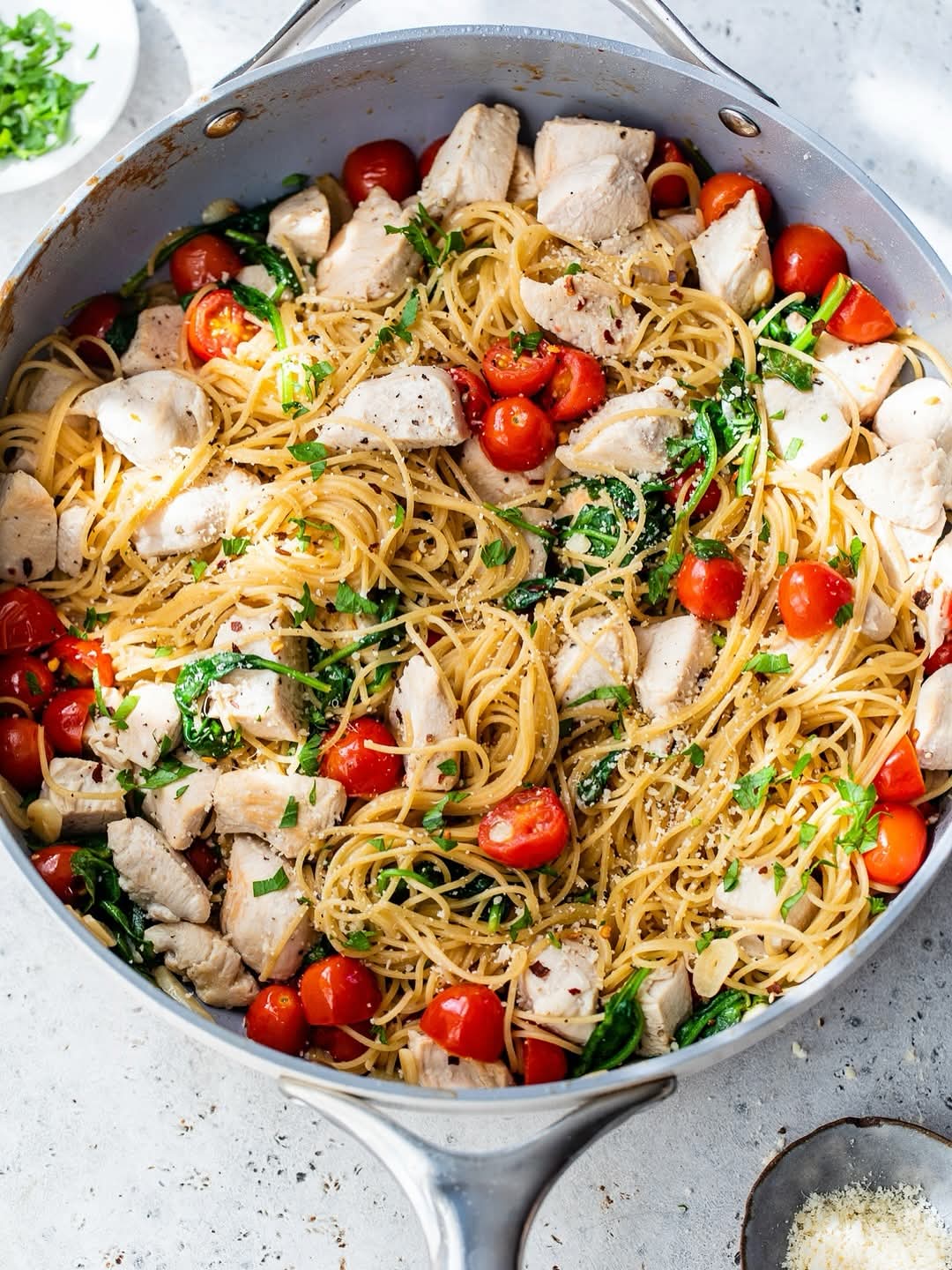 This Chicken Scampi is a lighter, high-protein twist on the classic Italian-American dish. Tender chicken breast is cooked with garlic, lemon, and a silky butter-based sauce, then tossed with pasta, fresh spinach, and tomatoes. It is perfect for busy weeknights because it comes together quickly while still tasting rich and satisfying.