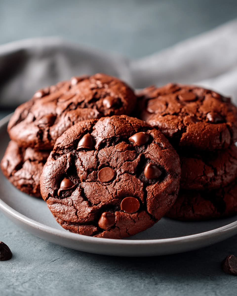 These double chocolate chip cookies are everything a chocolate lover could want: thick and bakery-style, deeply chocolatey, and soft in the center with rich chocolate chips in every bite. Made with cocoa powder and melted butter, the dough comes together easily and bakes into cookies with a brownie-like texture and a slightly crisp edge.